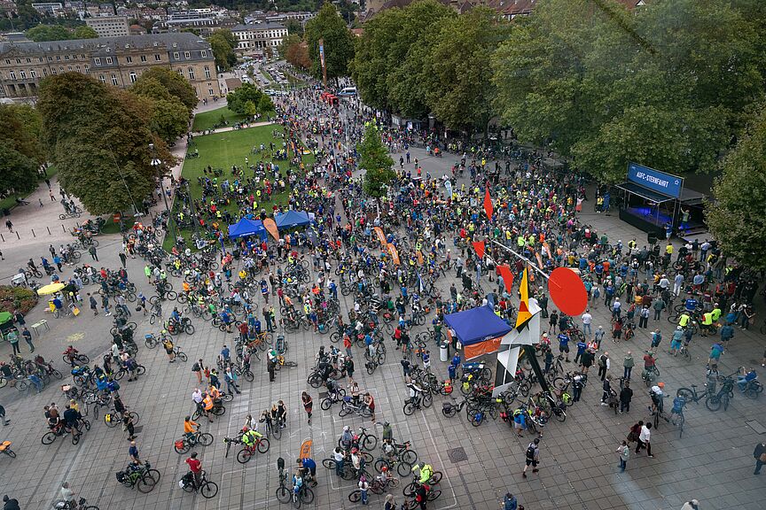 Sogar aus Freiburg, Karlsruhe, Heidelberg oder Schwäbisch Gmünd kamen Unterstützer*innen nach Stuttgart. Auf 12 polizeibegleiteten Strecken ging die Demo über die autofreien Bundesstraßen B10 und B14 bis zum Schlossplatz – endlich gab es mal richtig viel Platz fürs Fahrrad! Auch 350 Kinder der Kidical Mass Stuttgart radelten gut gelaunt zum Ziel, wo man schon seit vielen Jahren nicht mehr so viele Menschen mit Fahrrädern treffen konnte.